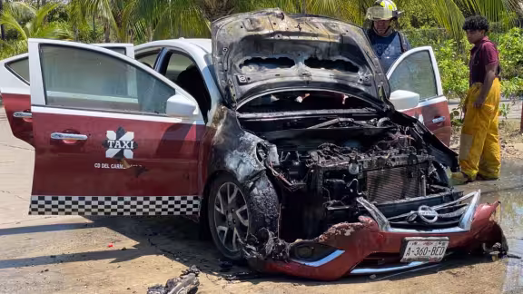 Un vehículo habilitado como taxi terminó completamente calcinado luego de incendiarse, presuntamente a causa de un cortocircuito, momentos después de salir de una gasolinera ubicada sobre la avenida Nardos, frente al fraccionamiento San Manuel.