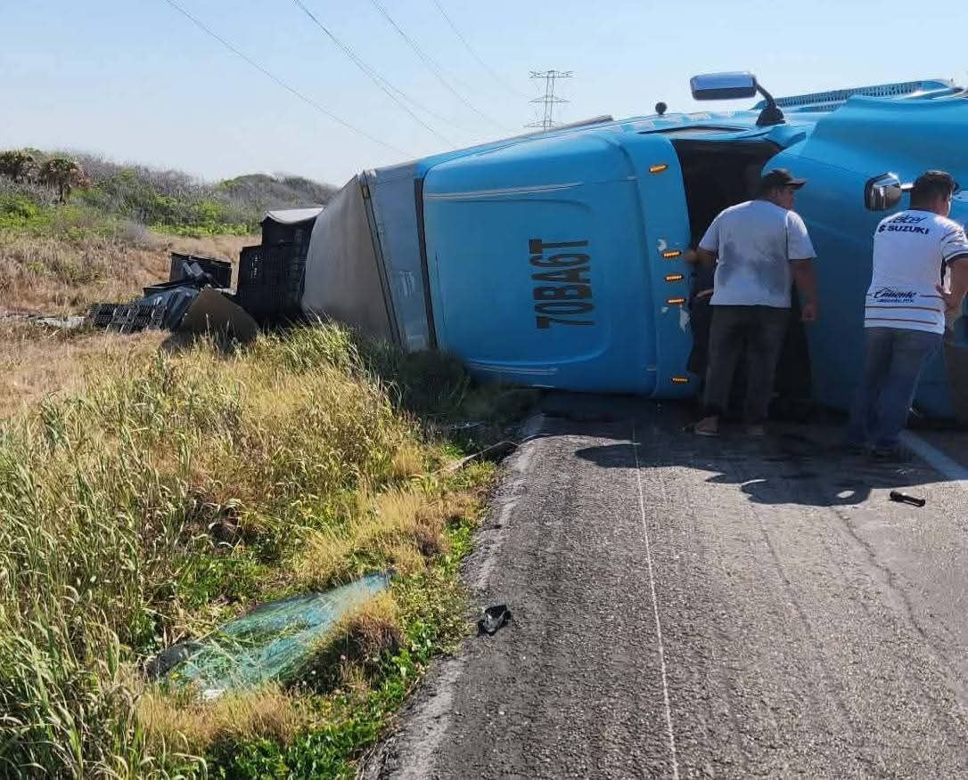 El domingo por la tarde se volteó un tráiler en la carretera federal 180 entre Isla Aguada y Sabancuy por el kilómetro 58, en donde el conductor del tracto camión perdió el control de la pesada unidad, quedó de lado la mayor parte fuera de la carretera y la cabina en la cinta asfáltica, afortunadamente no hubo heridos.