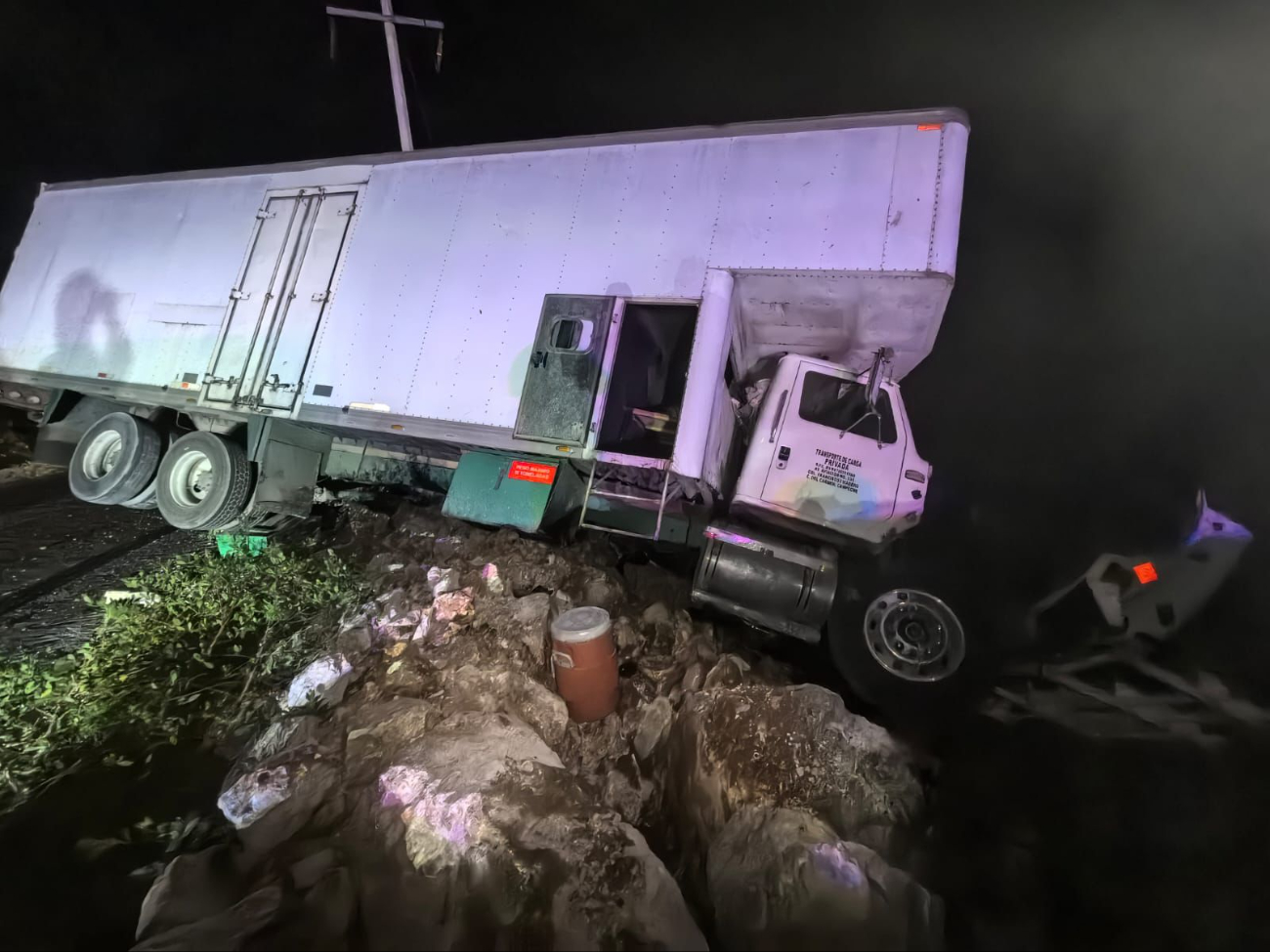 De acuerdo con los primeros reportes, el percance ocurrió cuando un camión de autotransporte tipo Tortón, de color blanco y con placas foráneas, circulaba sobre la vía federal. Presuntamente, un tractocamión tipo madrina con doble remolque lo golpeó de costado, provocando que el operador perdiera el control de la unidad y saliera de la cinta asfáltica.