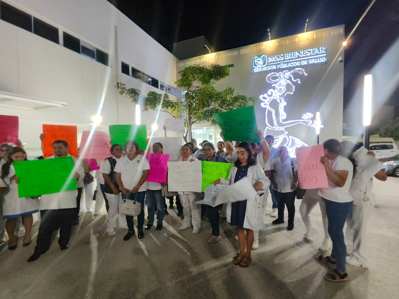 El personal médico, de enfermería, servicios generales y administrativo de la Sección 47 del Sindicato Nacional de los Trabajadores de la Salud (SNTSA), protestó pacíficamente este martes por la noche en las afueras del Hospital IMSS-Bienestar “Dr. Pedro Lara y Lara”, de la ciudad de Hopelchén, en donde dieron a conocer sus demandas, principalmente falta de personal, que les ha afectado severamente, y la falta de aire acondicionado en varias áreas del hospital.