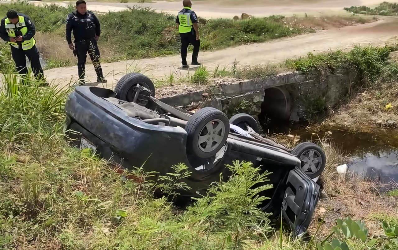 En Chiná, un automóvil volcó en la zanja del periférico Pablo García. El conductor huyó y la unidad fue retirada con grúa, causando retrasos en la circulación.