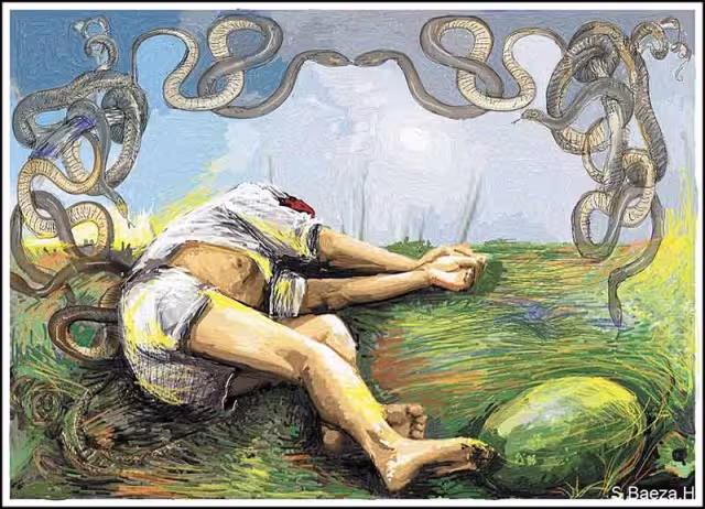 –Luciano, ¿ya te diste cuenta cómo pagas el pecado de andar robando productos de la milpa? Si esas serpientes no te hubieran permitido escapar, a estas horas estarías muerto. Tonto, aunque no lo creas, hay milperos que realizan ceremonias para pedir a los dioses de la naturaleza la protección de los productos de sus milpas. Lo sucedido, me hace recordar lo relatado por el abuelo Desiderio: “El milpero, para prevenir el robo del fruto de la sandía sembrada, hace una ceremonia para ofrendar saka’ (bebida ritual hecha con maíz) al Dios del Monte y a otros dioses de la naturaleza. El saka’ ofrendado no lo bebe cuando lo baja del pequeño altar de madera. Lo entierra en el tronco de la sandía, junto con nueve pedazos del bejuco conocido como táab ka’anil (cordón del cielo) esos nueve pedazos de bejuco se convierten en serpientes para ahuyentar al ladrón de sandía; nunca olvidaré las pláticas del abuelo”, concluyó sentenciosa Guadalupe.