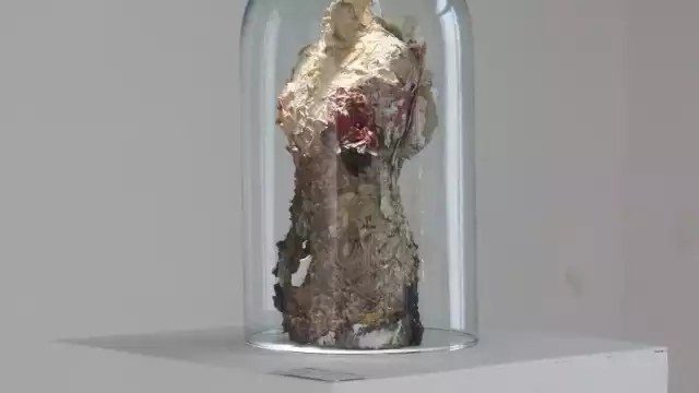 Un torso se deshoja entre costras de pintura en la última sala. “Algunos cuadros, como la escultura, incorporan pintura que iba encontrando en el suelo de la calle, que formaba parte de las fachadas de los edificios en las calles del Centro”, revela Sofía.