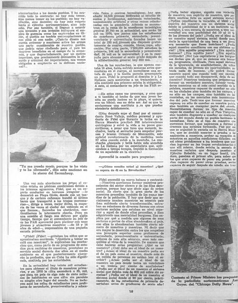 ¡Fidel! ¡Fidel! —gritaban los niños que se aproximaban corriendo. “¡Quédate a tomar un café con nosotras!”, le suplicaban las muchachas que, como parte de su programa de estudios para recibirse de maestras, prestaban su servicio social durante dos años en el medio ambiente en el que posteriormente ejercer{años la profesión{no, que en Cuba ha sido dignificada, exaltada por las autoridades.