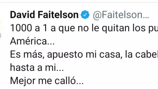 Ante la situación, y quizá sin meditarlo mucho, David Faitelson publicó en su cuenta de Twitter el siguiente mensaje: “1000 a 1 a que no le quitan los puntos al América... Es más, apuesto mi casa, la cabellera y hasta a mi... Mejor me calló...”