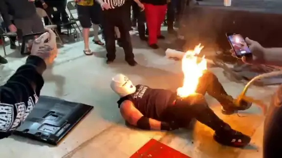 El fuego creció con facilidad y en un instante todo el pantalón del luchador estaba en llamas por lo que trató de quitarse el pantalón, pero, tropezó y las llamas siguieron causando estragos en su cuerpo, momentos después, algunas personas del público tratan de acabar con el fuego con sus camisas, pero las llamas no cedieron.