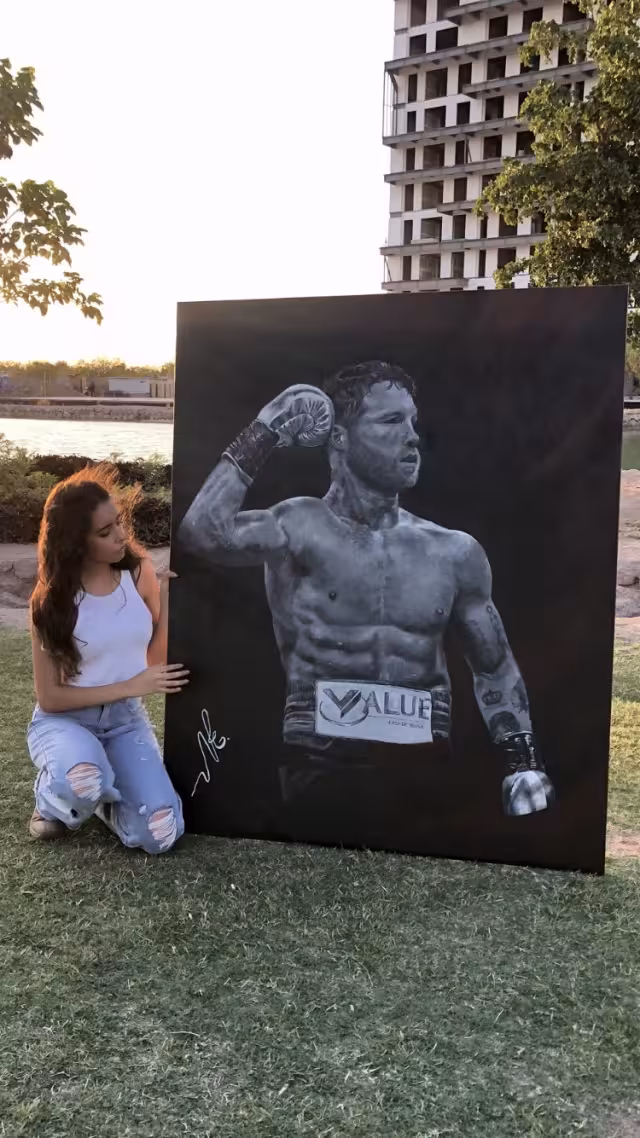 “Hola, soy Nicki. Tengo 17 años, soy de Hermosillo, Sonora. Estoy a nada de terminar la prepa y aún no me inscribo a una universidad por problemas económicos. Mi sueño es entrar a universidad de artes plásticas en la Ciudad de México. Después de 37 días termine mi pintura de Canelo, acrílico sobre lienzo”, escribió la usuaria.