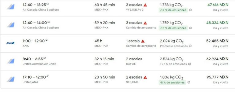 Aquí te compartimos una lista con los vuelos disponibles más actuales, incluye cantidad de escalas y costos, así como las aerolíneas disponibles: