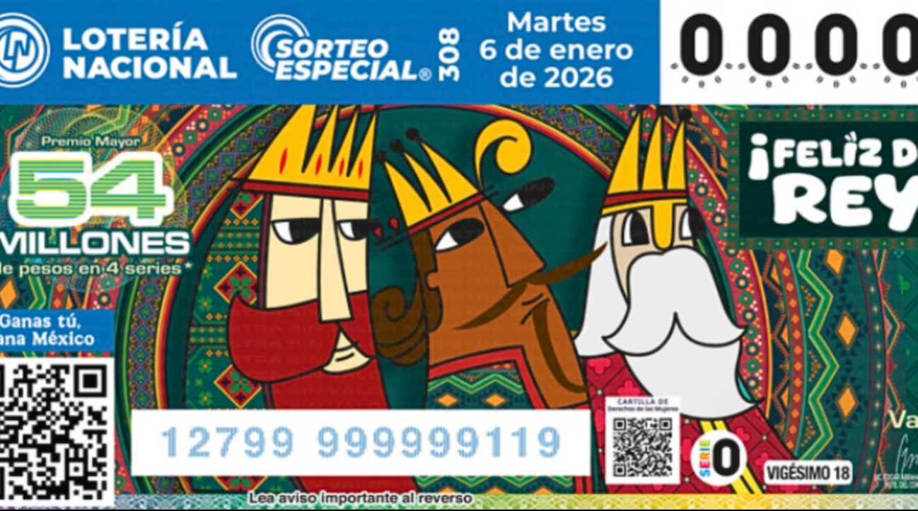 La Lotería Nacional celebró este martes 6 de enero de 2026 su tradicional Sorteo Especial 308 de Día de Reyes, en el que se entregó un premio mayor de 54 millones de pesos, distribuido en cuatro series, lo que incrementó las posibilidades de los participantes.