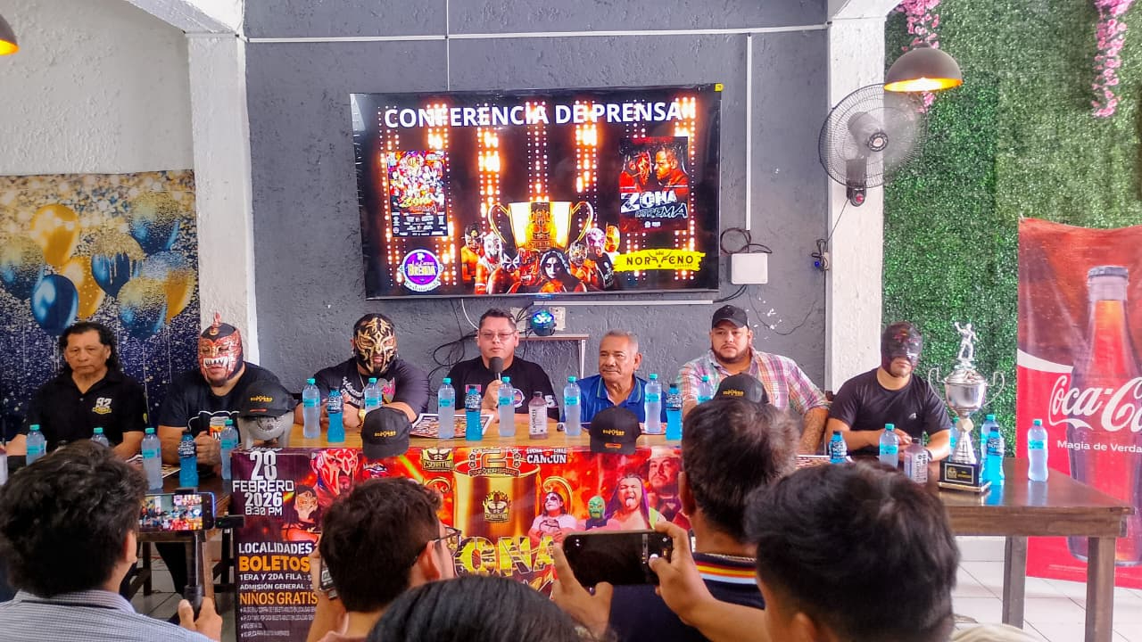 Los luchadores Rey Espartano y El Hijo del Noruego se agarraron a raquetazos, en la conferencia de prensa de la promoción de la lucha de apuestas de máscara contra contra cabellera, que se realizará este sábado 28 de febrero del 2026 en la Arena Colonos desde las 8:30 de la noche.