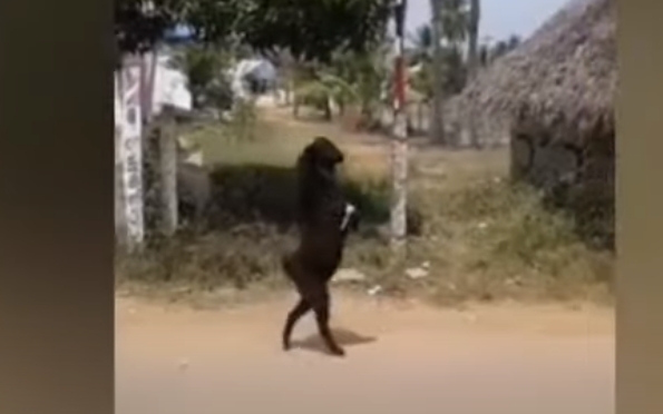 Se trata de un video en el que aparece una cabra erguida caminando sobre sus dos patas traseras en una comunidad perteneciente a la India.