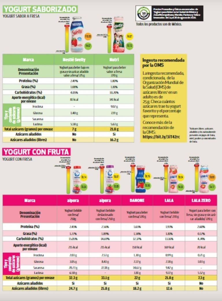 La Procuraduría Federal del Consumidor (Profeco) analizó 21 marcas de yogurt bebible natural y de sabor a fresa en este estudio, donde identificó que aunque algunos afirman estar reducidos en azúcar, contienen edulcorantes como acesulfame y sucralosa.