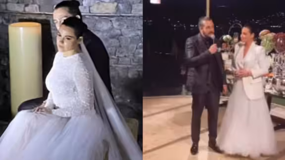 La pareja se casó en Valle de Bravo, Estado de México y según reportan varios medios de espectáculos, la exintegrante de Rebelde utilizó dos vestidos de novia. El primero de cuello redondo y mangas largas, resaltando con algunos patrones en ondas. La parte de la espalda lució un escote y por debajo tela transparente que impedía ver su piel.