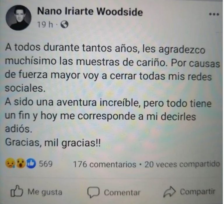 "A todos durante tantos años, les agradezco muchísimo las muestras de cariño. Por causas de fuerza mayor voy a cerrar todas mis redes sociales. Ha sido una aventura increíble, pero todo tiene un fin y hoy me corresponde a mí decirles adiós. ¡Gracias, mil gracias!", escribió.