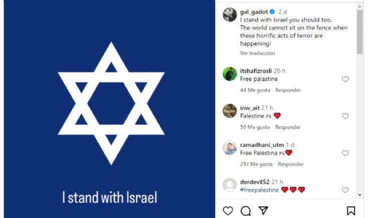La actriz Gal Gadot, conocida por su papel de la 'Mujer Maravilla', también se pronunció sobre el conflicto. A través de una foto en Instagram en la que muestra la estrella de David, expresó su apoyo al pueblo israelí y su condena a los actos de terror.