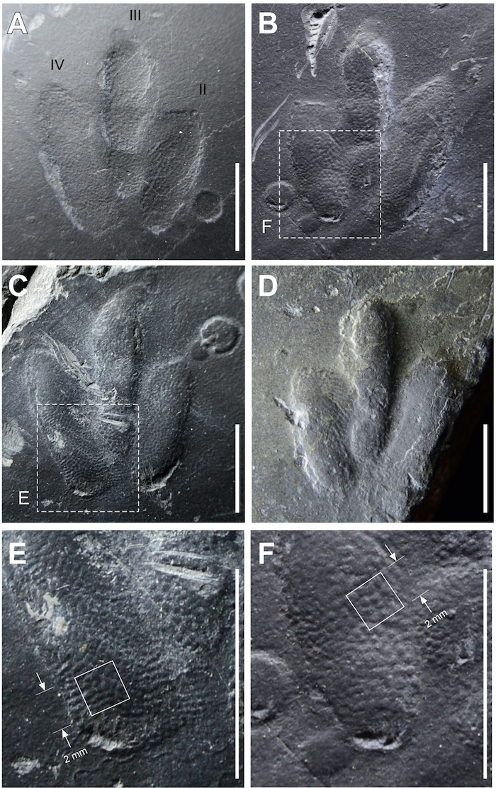 El estudio, publicado en Scientific Reports, informa que el patrón de piel es similar a los ejemplos de las huellas de dinosaurios terópodos carnívoros, mucho más grandes, en las que las escamas son mucho más grandes pero nunca se conservan en toda la huella.