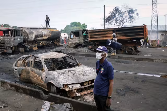 Según testigos, un camión cisterna explotó en una gasolinera, después de haber sufrido un accidente. Luego, el fuego se propagó por el vecindario. Varios cuerpos calcinados fueron descubiertos en los automóviles y las calles cercanas.