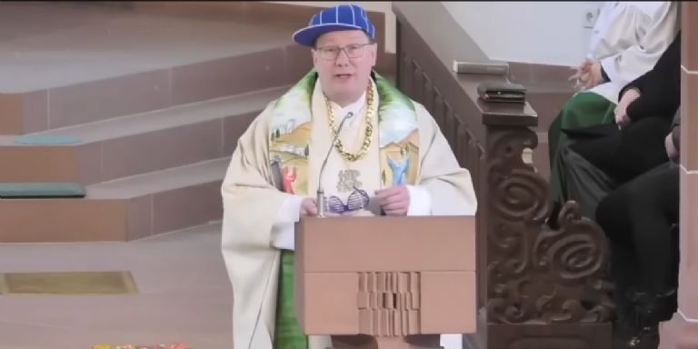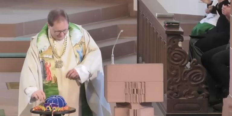 Eschenbacher, sacerdote de la iglesia de Hammelburg, Alemania, ofició su misa con su habitual sotana, por supuesto, pero también añadió a su vestimenta otros elementos más 'callejeros'.