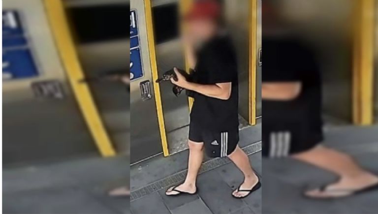 Imágenes del martes de cámaras de videovigilancia muestran a un hombre caminar por el andén de una estación en el norte de Brisbane y acariciar al animal bajo su brazo.