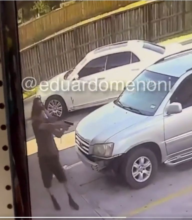 Mientras toda la escena se desarrollaba en cuestión de segundos, un conductor atrapado en la ráfaga decidió arrancar su auto y escapar del lugar. Lo que dejó al agresor sin protección y en la mira del hombre que le apuntaba con un arma.