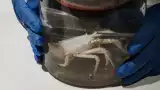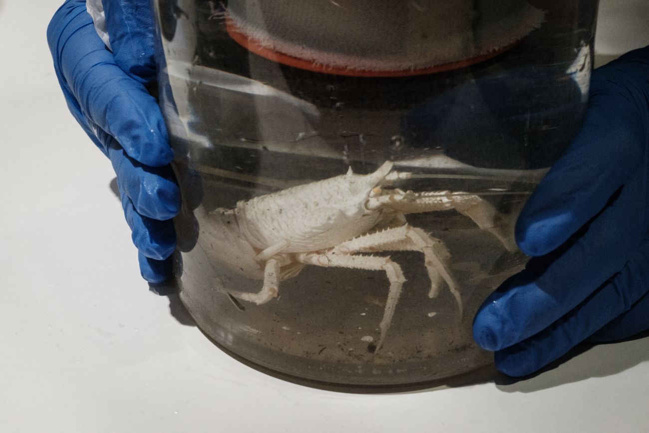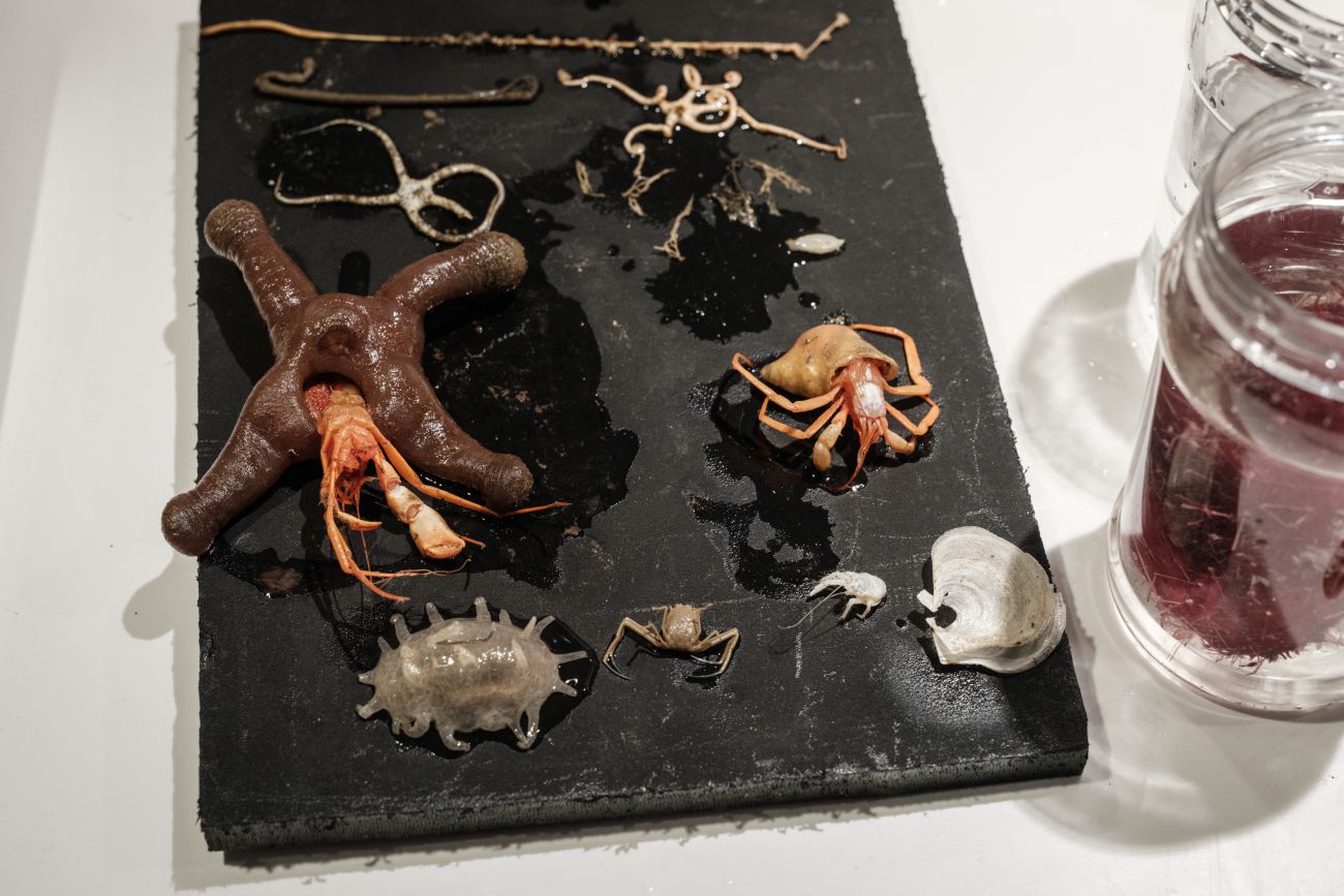 Hay una langosta blanca, aspirada para su examen en superficie, y un pepino de mar cuyos pinchos se colapsan en espaguetis negros cuando llega al barco.