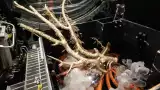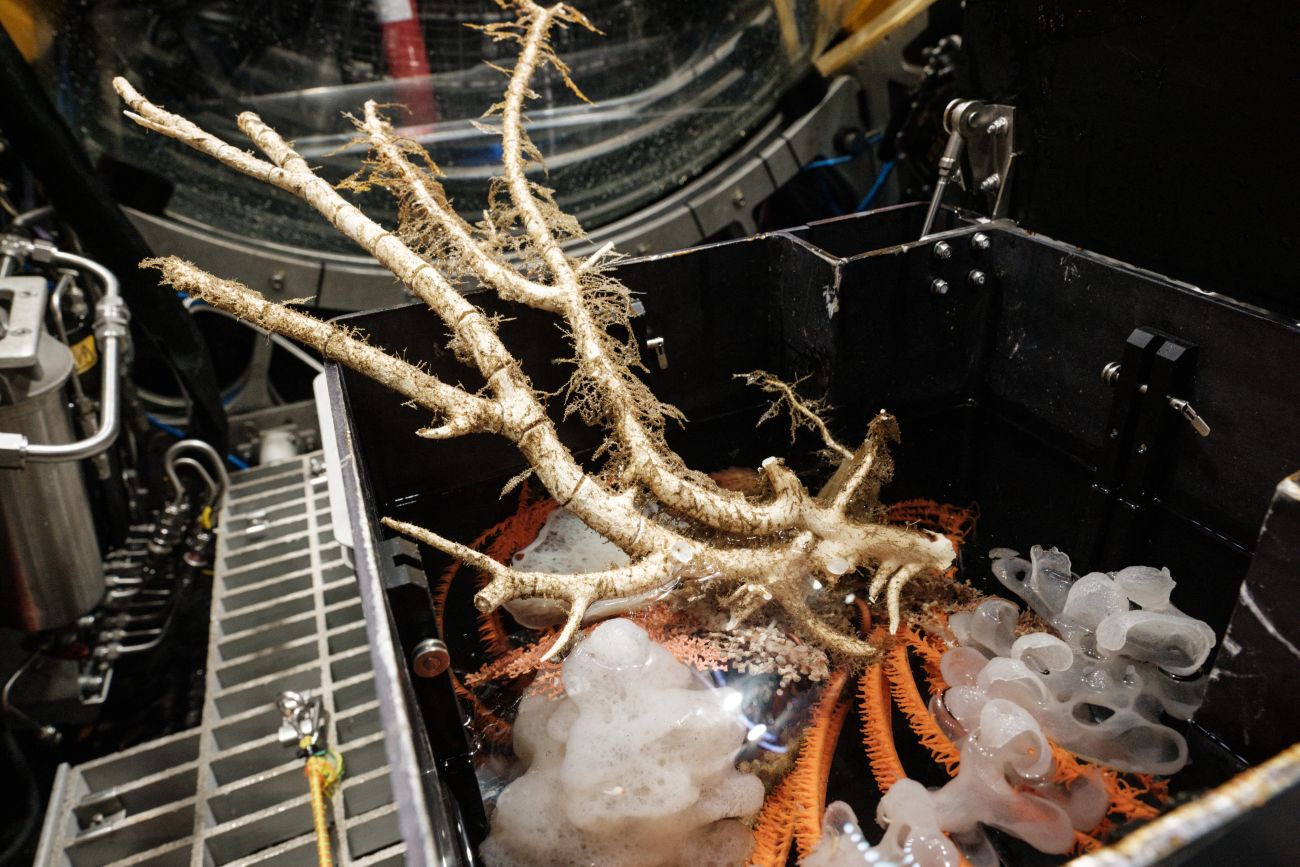 Cuando regresa el ROV, se produce una carrera entusiasmada por las muestras, entre ellas agua de mar, sedimento y un lirio de mar del largo de un antebrazo cubierto de un líquido color naranja.