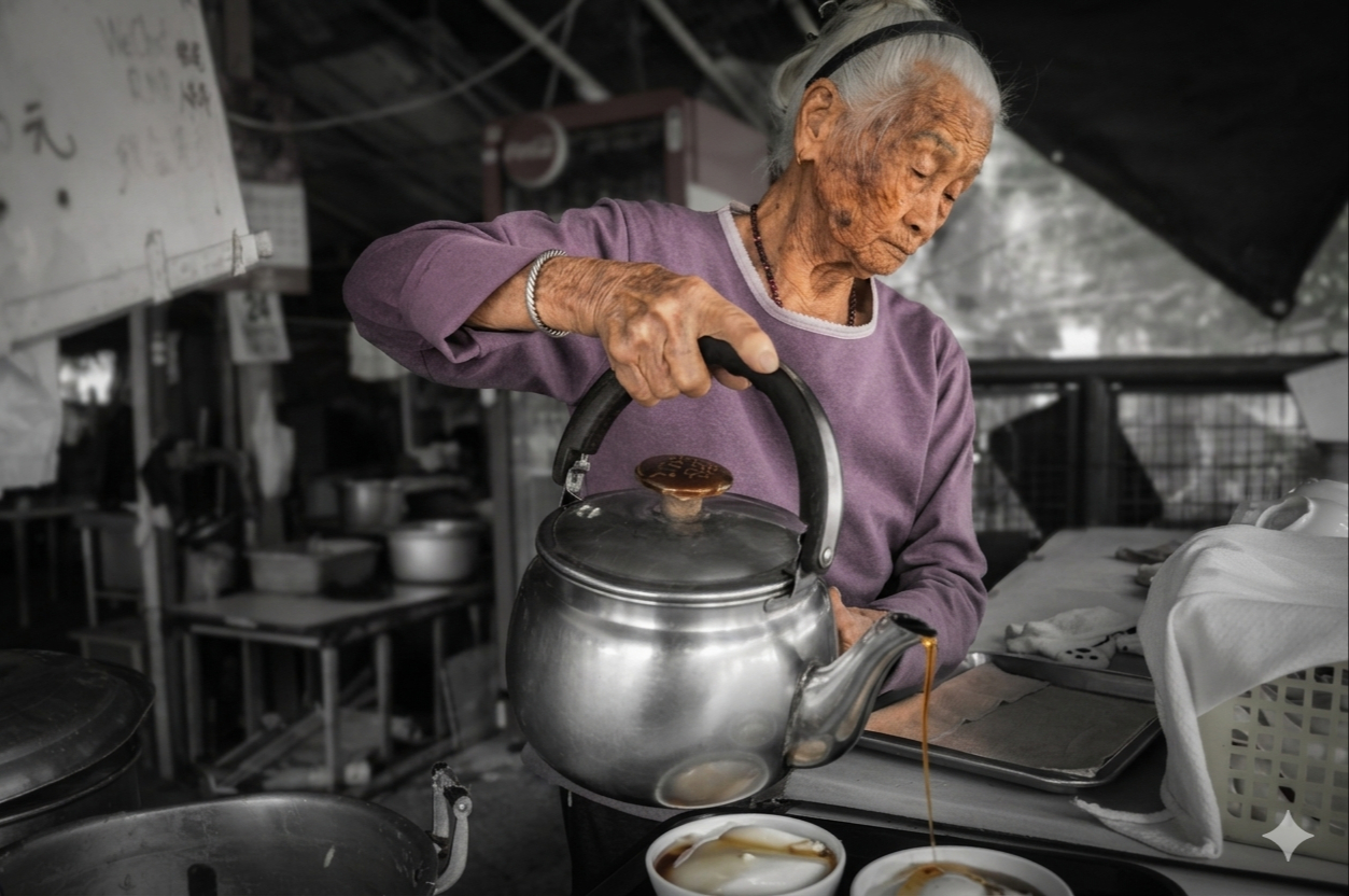 La historia de este puesto comenzó hace medio siglo, cuando la vida en Lamma era mucho más ruda y solitaria. Mientras el mundo exterior se transformaba en una metrópolis de cristal y acero, ella permaneció fiel a su rutina. Cada mañana, antes de que el sol termine de despertar, comienza el ritual de preparar el tofu. Es un proceso paciente, casi meditativo, que requiere manos expertas para lograr esa textura sedosa que se deshace en la boca, bañada apenas con un toque de almíbar de jengibre o azúcar morena.