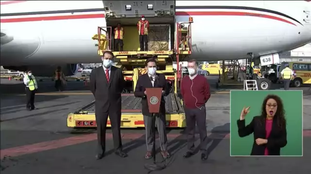 Zoé Robledo, titular del IMSS, Pedro Zenteno, director general de Birmex y Rodlfo Lehman, de Pemex, fueron los encargados de recibir este cargamento en el Aeropuerto Internacional de la Ciudad de México (AICM) transportado por el vuelo 951 de CargoJet, proveniente de Bruselas.