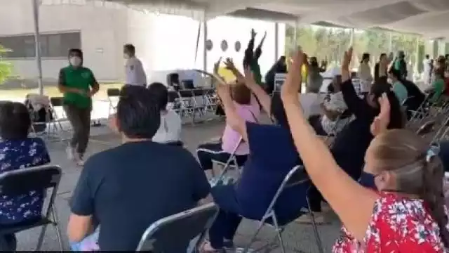 En dicho material, se observa a los adultos que fueron inoculados contra coronavirus sentados, moviendo los brazos de manera rítmica, mientras son guiados por un grupo de animadores.