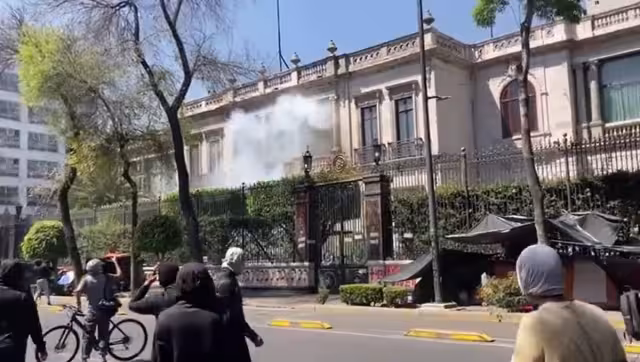 Asimismo al concluir el mitin, los manifestantes lanzaron cohetones contra la fachada principal del edificio, sin que se reportaran hasta el momento personas lesionadas.