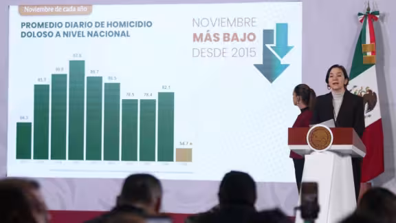 En septiembre del año pasado se registraba un promedio diario de 86.9 homicidios, mientras que en noviembre de 2025 la cifra descendió a 54.7, equivalente a 32 casos menos por día.