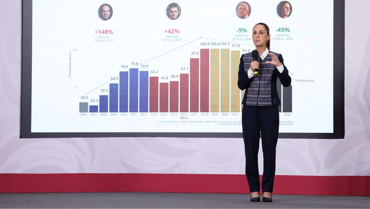 En contraste, señaló que en la administración anterior comenzó un cambio de tendencia, y en el actual gobierno se ha profundizado la reducción. Con cifras preliminares, indicó que el promedio diario de homicidios pasó de 91.7 en 2024 a 50.8 en 2026, lo que representa una disminución cercana al 45 por ciento.
