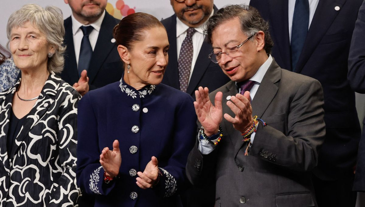 La presidenta de México, Claudia Sheinbaum Pardo en un diálogo con su homologo de Colombia, Gustavo Petro durante la IV Cumbre en Defensa de la Democracia