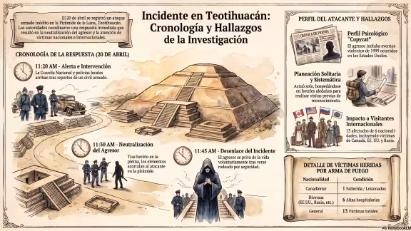 El Gobierno federal y autoridades del Estado de México dieron a conocer la cronología oficial del ataque armado ocurrido en la zona arqueológica de Teotihuacán, un hecho que dejó dos personas sin vida —incluido el agresor— y un total de 13 lesionados.