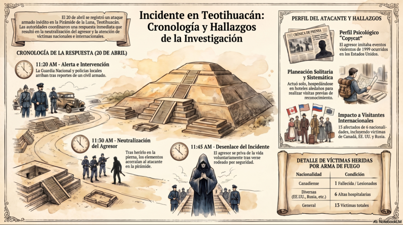El Gobierno federal y autoridades del Estado de México dieron a conocer la cronología oficial del ataque armado ocurrido en la zona arqueológica de Teotihuacán, un hecho que dejó dos personas sin vida —incluido el agresor— y un total de 13 lesionados.