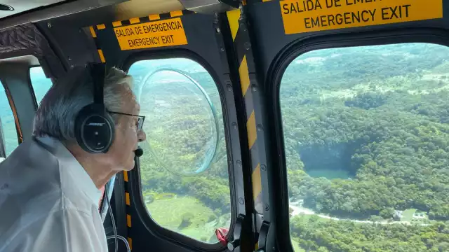 En la imagen se puede ver a AMLO mientras contempla desde el helicóptero en el que se transporta, la naturaleza de la zona en la que incluso se alcanza a observar un amplio cenote abierto, al mismo tiempo que el mandatario expresó al respecto: "En toda la ruta del Tren Maya hay cenotes, selva con flora y fauna tropical, playas, ríos, lagunas y los sitios arqueológicos más importantes del mundo por su arte, ciencia y cultura. Es una obra espléndida".