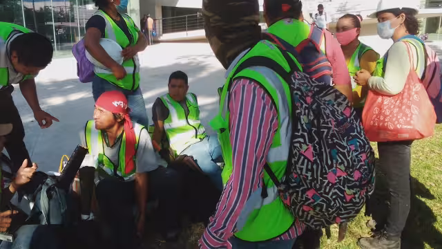 Un grupo de personas que realizan trabajos del Tren Maya se manifiestan afuera de sus oficinas exigiendo una mejora salarial,  por ser un trabajo de riesgo donde algunos, incluso, han sufrido ataques de serpientes en medio de la selva.