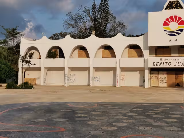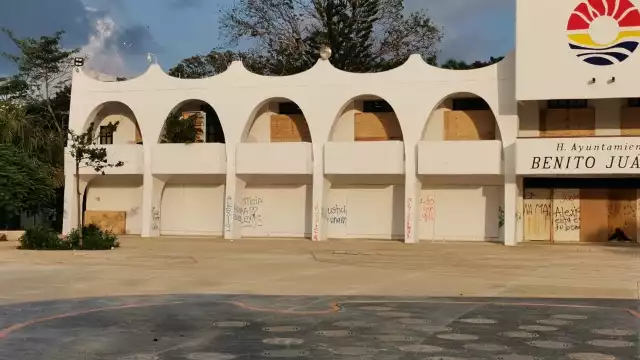 En las ventanas del inmueble ubicado en la avenida Tulum, se aprecian maderas pintadas de blanco para proteger los equipos y documentos del ayuntamiento, pues aún no han sido instaladas en su totalidad las ventanas.