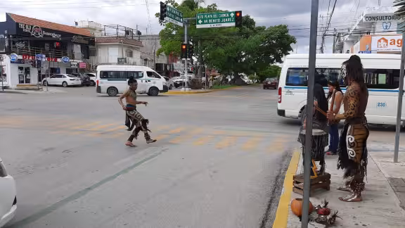 Con danzas prehispánicas en semáforos se ganan el sustento en Playa del Carmen