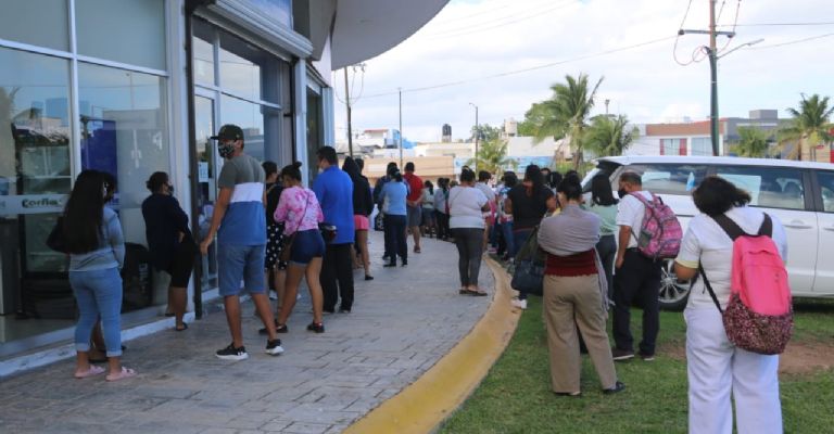 Decenas de personas formaron largas filas en una sucursal bancaria ubicada en la Avenida Coba en Cancún, para realizar el pago de reinscripción al Colegio de Estudios Científicos y Tecnológicos (Cecyte) y el Colegio de Bachilleres, para continuar en la matrícula el siguiente semestre.