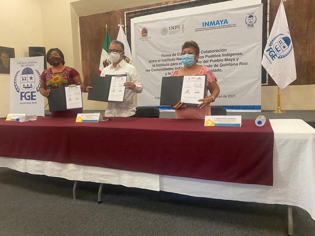 El Instituto para el Desarrollo de los Pueblos Mayas en Quintana Roo (Inmaya) y el Instituto Nacional de los Pueblos Indígenas firmaron un convenio de colaboración con la Fiscalía General del Estado, para no dejar en indefensión a las personas de estas etnias.