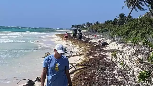 Habitantes de Mahahual crean barreras artesanales por el recale de sargazo