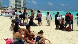 Semáforo Naranja no impide a turistas abarrotar Playa Forum en Cancún