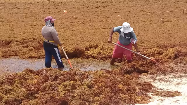 Sin recibir hidratación, los trabajadores de la Zona Federal Marítima Terrestre (Zofemat) tienen que laborar en condiciones desgastantes debido al gran esfuerzo físico que realizan, al recolectar las toneladas de sargazo que llegan a las costas, aunado a las altas temperaturas.