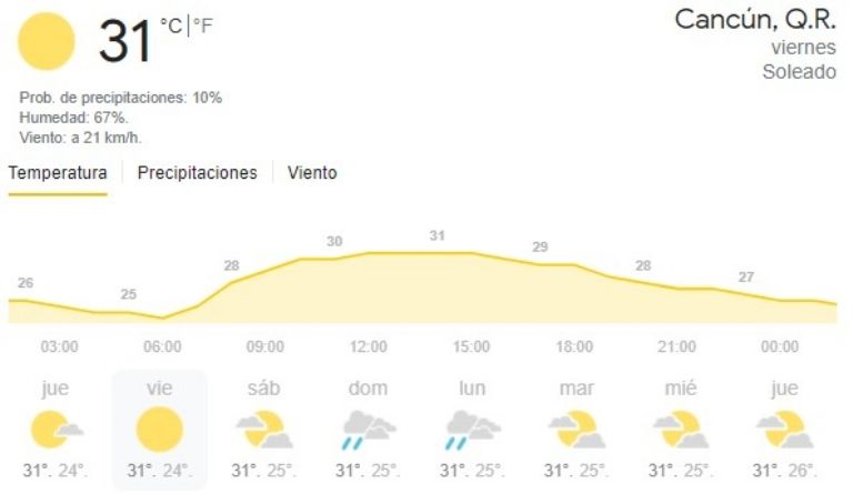Se espera cielo parcialmente nublado durante el día, por la tarde se incrementará la nubosidad y se pronostican lluvias con intervalos de chubascos acompañados de descargas eléctricas en Campeche, así como lluvias aisladas en Yucatán y Quintana Roo. Habrá ambiente templado por la mañana y caluroso por la tarde con viento de componente este de 10 a 25 kilómetros por hora con rachas de 50 kilómetros por hora en costas de Campeche y Yucatán, informó el Servicio Meteorológico Nacional (SMN).