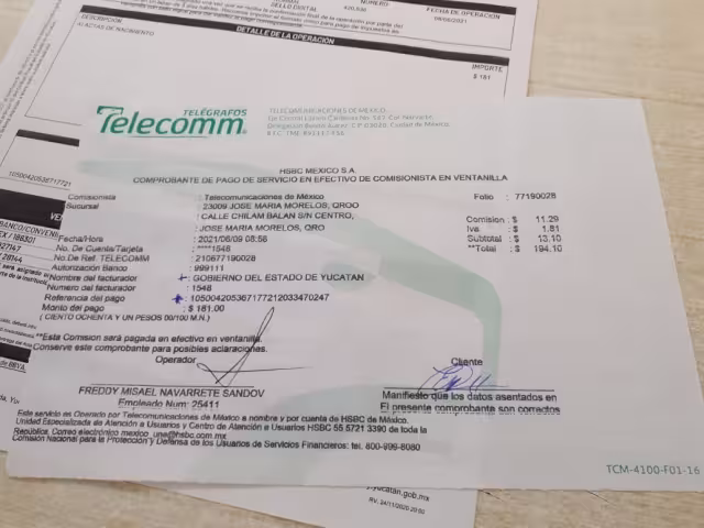 Dijo que  él  pagó el Telecom 181 pesos, que es lo  que cuesta el acta de nacimiento en Yucatán, desde la mañana del pasado miércoles.
