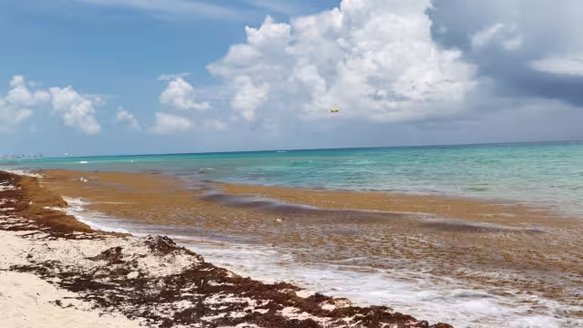 La presencia de sargazo en dicho arenal se puede ver desde las inmediaciones del hotel Iberoestar, siendo el costado izquierdo de dicha playa el más afectado hasta el momento por el recale de esta alga, la cuál obligó a los usuarios a mantenerse en las palapas de descanso de dicha playa.