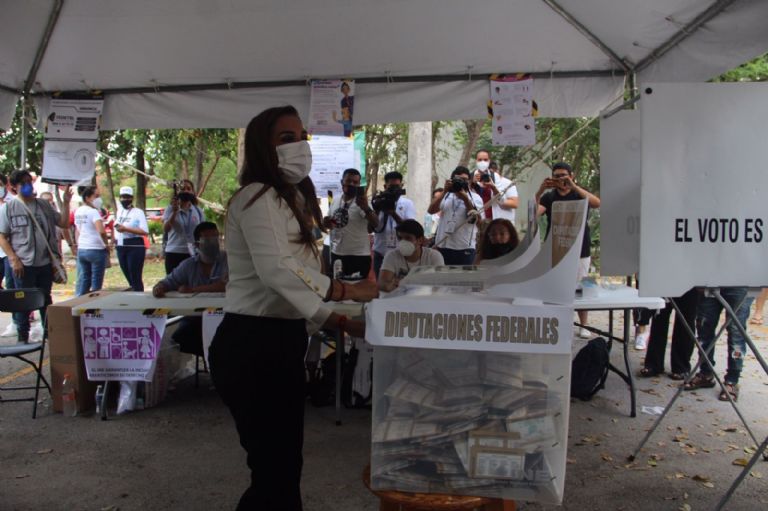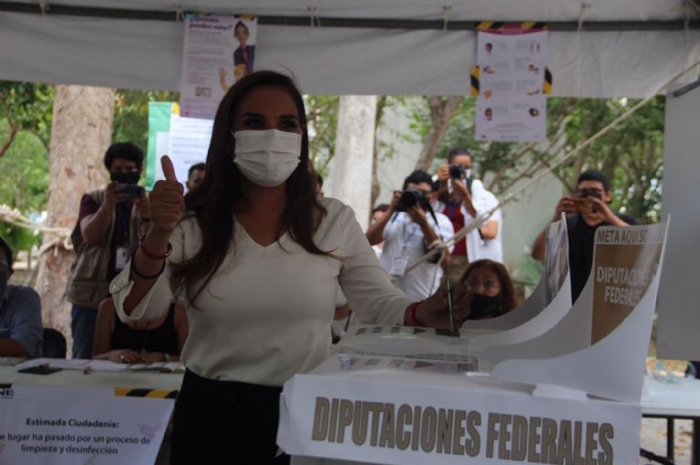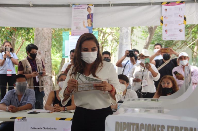 La candidata a presidenta municipal de Benito Juárez, Mara Lezama emitió su voto en la casilla ubicada al interior de la Casa de la Cultura de dicho ayuntamiento.