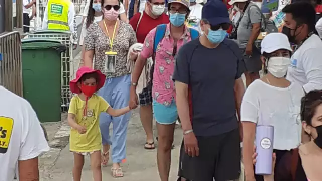 Respetando las medidas sanitarias con el uso correcto del cubrebocas, las parejas y grupos que descendían de los barcos se dirigieron a los distintos muelles de la isla donde ya tenían adquirido sus paquetes de tours.