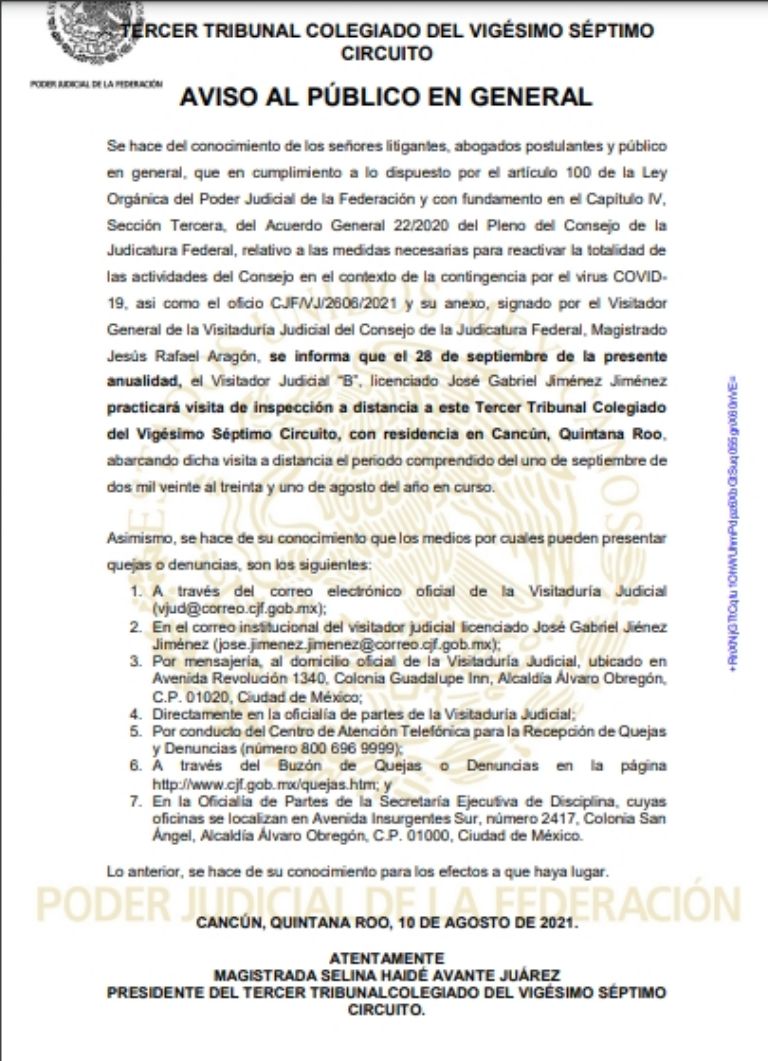 El Poder Judicial, por medio de un comunicado, dio a conocer que la Visitaduría General del Consejo de la Judicatura Federal la que se encargue de realizar las indagatorias correspondientes sobre el actual de los magistrados del Tercer Tribunal Colegiado de Quintana Roo en el último año.